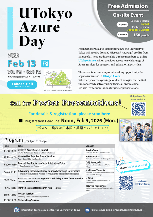 2026年2月13日(金)に、UTokyo Azure利用者同士のネットワーキングや、UTokyo Azureの使い方・活用事例の紹介を目的としたユーザ会「UTokyo Azure Day」を開催いたします。多くの皆様のご参加をお待ちしております。